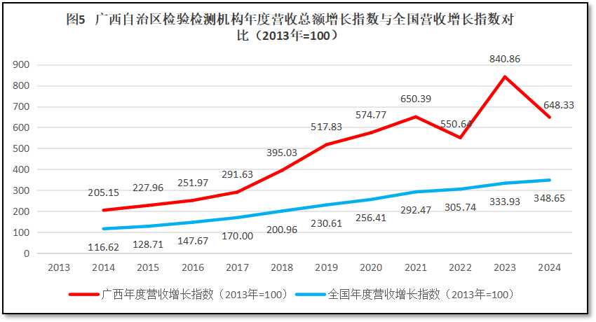 由图5可见,广西壮族自治区检验检测机构营收总额增长指数一直高于全国平均数,2021年之前有逐步拉开与全国平均线差距的趋势。但最近三年,广西壮族自治区的曲线出现较大波动,2022年和2024年度两次下跌,与全国平均数的差距有所缩小。总的来看,广西壮族自治区检验检测行业发展质量较好,营收增长指数在2022年和2024年度虽然出现下降的情况,但仍领先全国平均数较多,说明广西壮族自治区检验检测行业发展的基础比较牢固,行业结构和发展质量总体仍处于较好的状态。最近几年的数据波动,除了统计误差之外,还可能受外贸型经济变动幅度大、行业改革调整力度大等因素的影响。